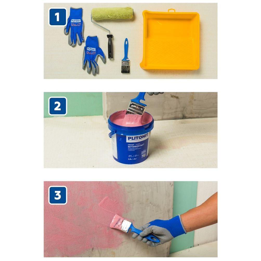 Продукт предназначен для предварительной обработки оснований с низким водопоглощением (монолитный бетон, плиты перекрытий, бетонные блоки, цементные штукатурки и т.п.) перед проведением штукатурных, облицовочных работ и работ по устройству полов. Обладает высокой кроющей способностью, грунтовка стен и полов из бетона обеспечивает улучшение сцепления наносимых поверх покрытий – цементных, гипсовых, известково-цементных, известково-гипсовых и полимерных составов.